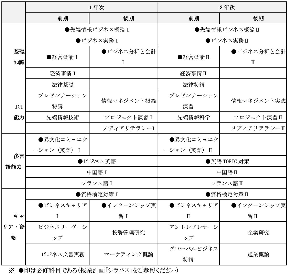 「先端情報ビジネス概論」、「ビジネス実務」、「経営概論」等の科目を開設し、ビジネスに関する必要な基礎概念、 分析方法等を理解できるよう、学修段階に応じて授業を進める。
