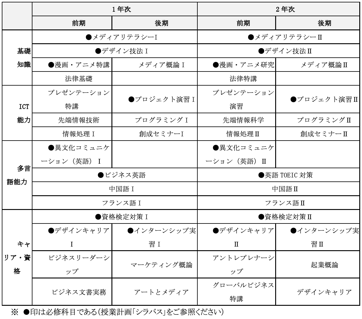 「メディアリテラシー」、「デザイン技法」、「情報処理」等の科目を開設し、メディアデザインに関する必要な基礎概念、 デザイン手法等を理解できるよう、学修段階に応じて授業を進める。